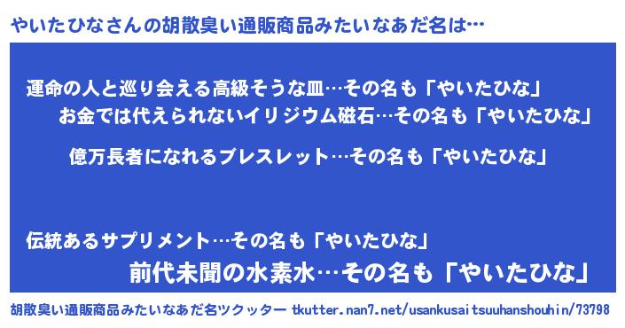 | 男性向けラノベタイトル風あだ名 | 『やいたひなに滅ぼされるだけの簡単なお仕事です』 |