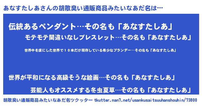 | 意味不明あだ名 | 『住所不定無職あなすたしあ(95歳)』 |