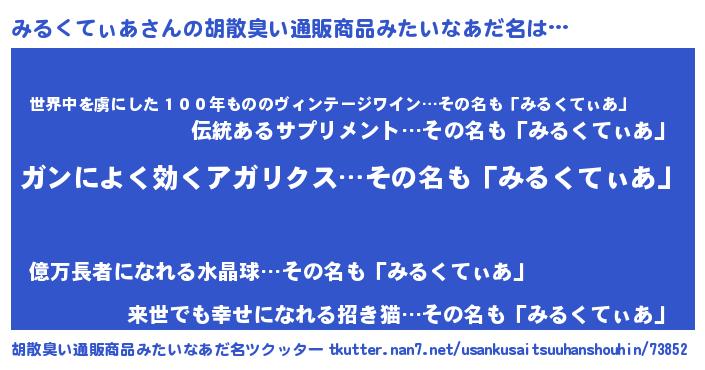 | ヘコむあだ名 | 『みるくてぃあ(笑)』『みる太郎』 |