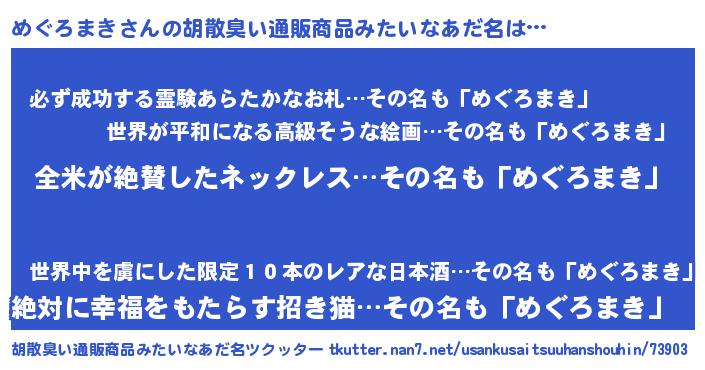 | 男性向けラノベタイトル風あだ名 | 『めぐろまき~年齢イコール彼女いない歴の魔法使い~』 |