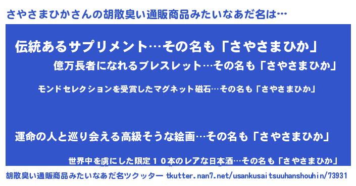 | 男性向けラノベタイトル風あだ名 | 『うちのさやさまひかが世界を掌握している!』 |