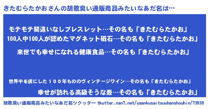| ヘコむあだ名 | 『きたむらたかお(笑)』『きたふぇ~』 |