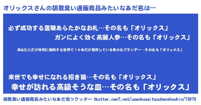 | 男性向けラノベタイトル風あだ名 | 『この素晴らしい世界にオリックスを!』 |