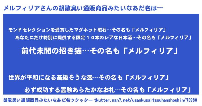 | ヘコむあだ名 | 『メルフィリア(笑)』『メルにー』 |