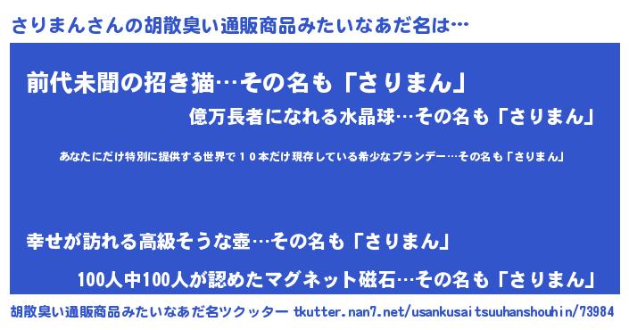 | 男性向けラノベタイトル風あだ名 | 『この素晴らしい世界にさりまんを!』 |