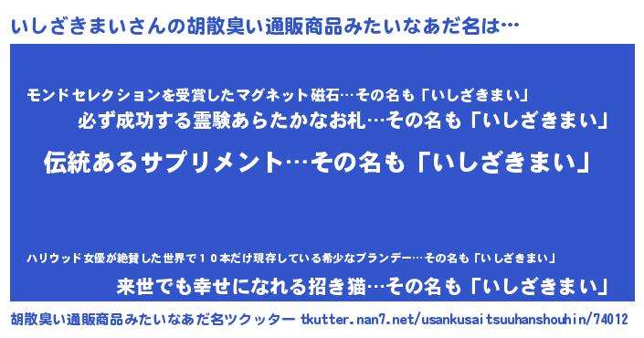 | ヘコむあだ名 | 『いしお』『いしざきまい(笑)』 |