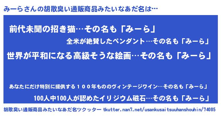 | 意味不明あだ名 | 『なめこ科みーら属』『永久保存みーら』 |