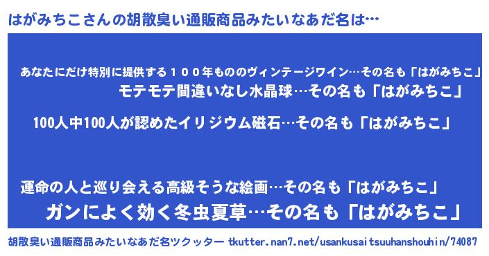 | 男性向けラノベタイトル風あだ名 | 『おまえをオタクにしてやるから、俺をはがみちこにしてくれ! 』 |