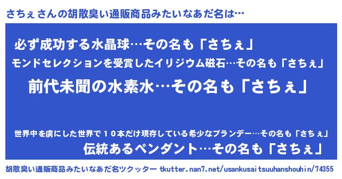 | 男性向けラノベタイトル風あだ名 | 『さちぇに滅ぼされるだけの簡単なお仕事です』 |