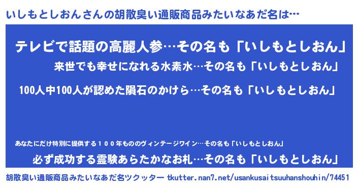 | 男性向けラノベタイトル風あだ名 | 『おまえをオタクにしてやるから、俺をいしもとしおんにしてくれ! 』 |