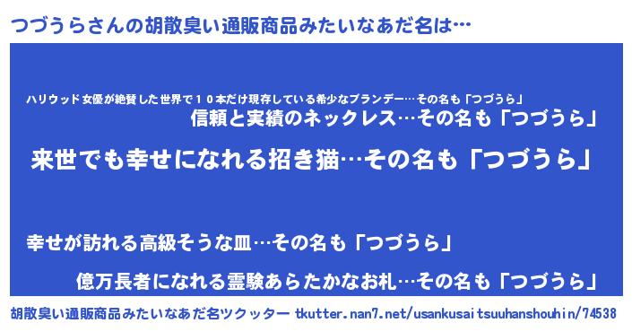 | 男性向けラノベタイトル風あだ名 | 『転生したらつづうらだった件』 |