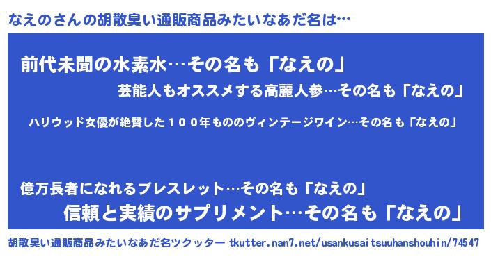 | 意味不明あだ名 | 『住所不定無職なえの(2歳)』『自称なえの』 |