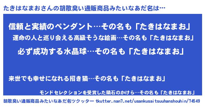 | 男性向けラノベタイトル風あだ名 | 『たきはなまおの憂鬱』 |