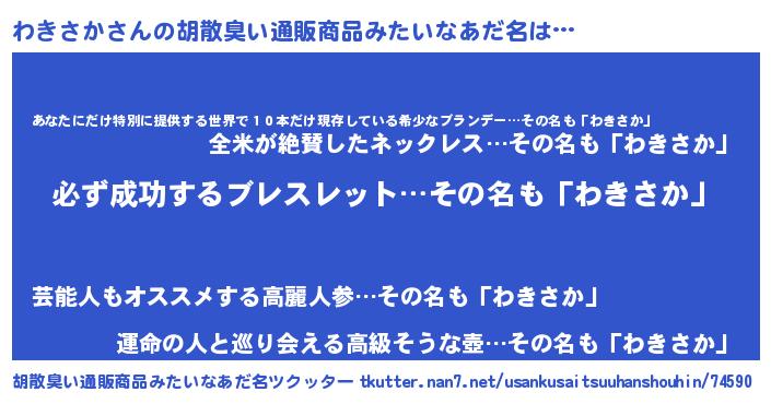 | 男性向けラノベタイトル風あだ名 | 『ワキサカスレイヤー』『わきさかの憂鬱』 |