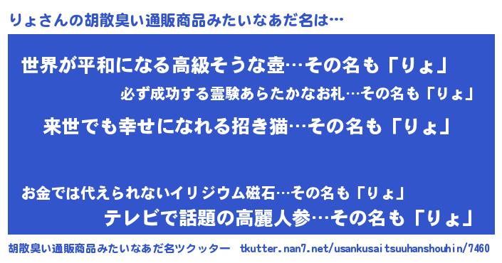 | 男性向けラノベタイトル風あだ名 | 『りょという概念が存在しない退屈な世界 』 |