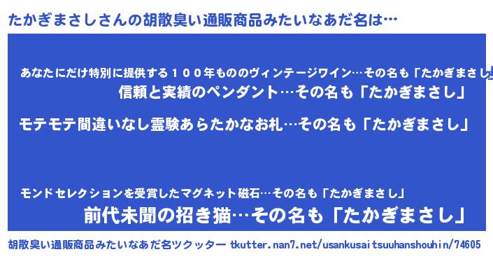| ヘコむあだ名 | 『たかっふぃ~』『たかぎまさし(苦笑)』 |