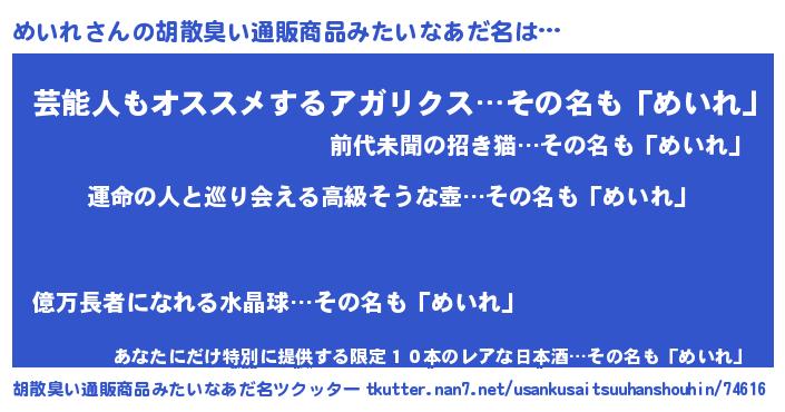 | ヘコむあだ名 | 『レバニラ』『めいれ(爆)』『めいを』 |