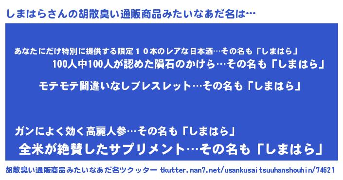 | ヘコむあだ名 | 『しまにー』『しまっ子』『酢こんぶ』 |