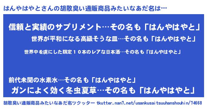 | ポケモン風あだ名 | 『ハーンイ』『ヒハンヤハヤト』 |