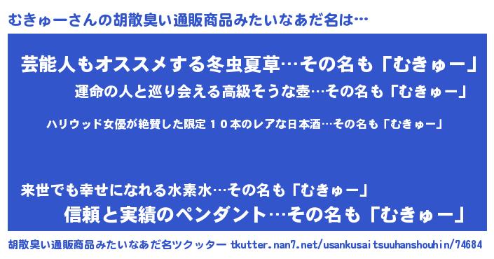 | 意味不明あだ名 | 『住所不定無職むきゅー(65歳)』 |