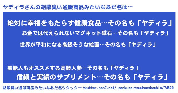 | 男性向けラノベタイトル風あだ名 | 『転生したらヤディラだった件』 |