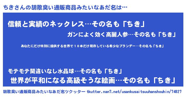 | 意味不明あだ名 | 『住所不定無職ちき(74歳)』『自称ちき』 |