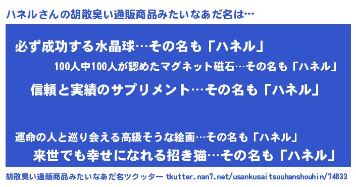 | 意味不明あだ名 | 『とにかく怪しいハネル』 |
