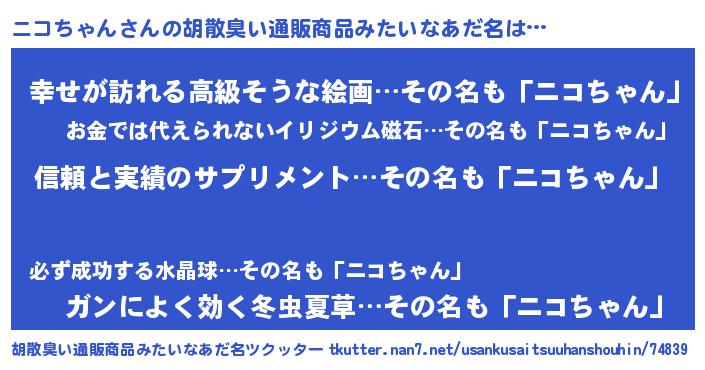 | 男性向けラノベタイトル風あだ名 | 『ダンジョンにニコちゃんを求めるのは間違っているだろうか』 |