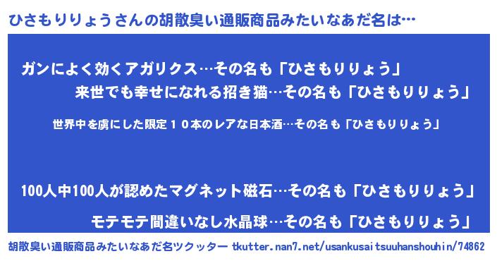 | 意味不明あだ名 | 『住所不定無職ひさもりりょう(68歳)』 |