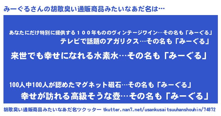 みーぐるさんの胡散臭い通販商品みたいなあだ名をツクッター!