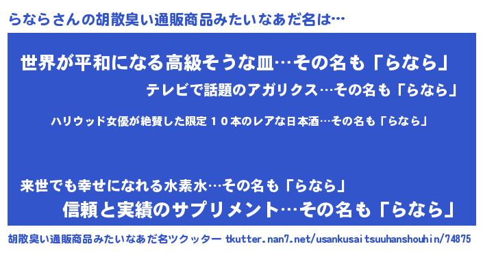 | 意味不明あだ名 | 『住所不定無職らなら(53歳)』『自称らなら』 |
