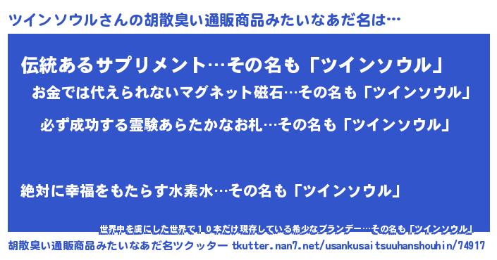 | 男性向けラノベタイトル風あだ名 | 『ツインソウルの憂鬱』 |