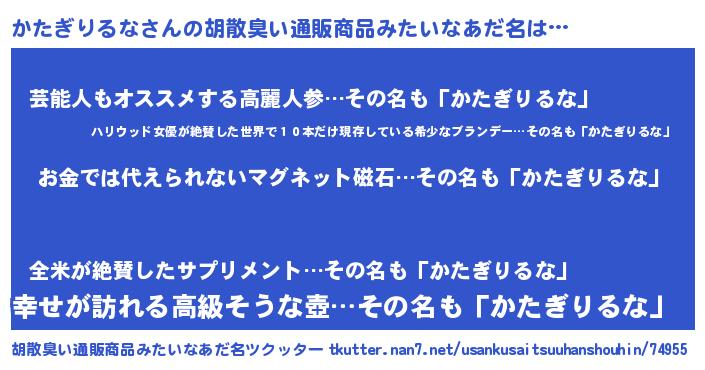 | 男性向けラノベタイトル風あだ名 | 『転生したらかたぎりるなだった件』 |