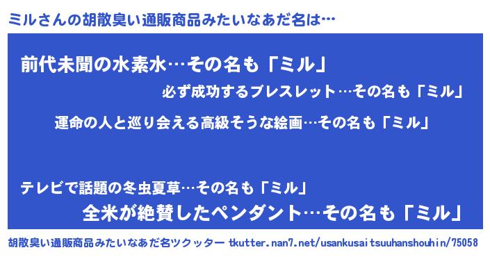 | ヘコむあだ名 | 『酢こんぶ』『ミル(笑)』『ミルっ子』 |