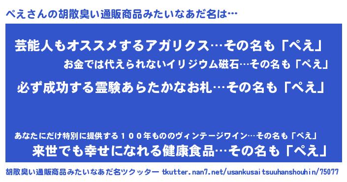 | 男性向けラノベタイトル風あだ名 | 『ぺえの憂鬱』『転生したらぺえだった件』 |