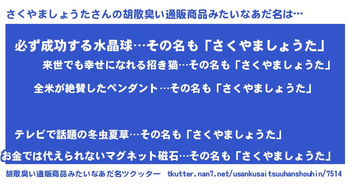 | 男性向けラノベタイトル風あだ名 | 『さくやましょうたの嫁は女の子じゃないと思った?』 |
