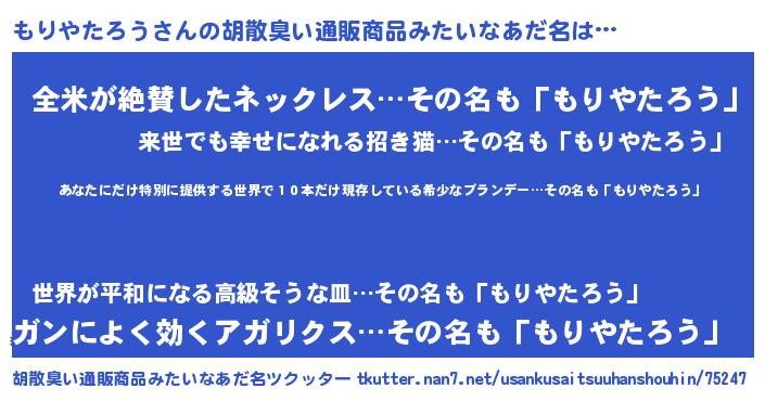 | 男性向けラノベタイトル風あだ名 | 『この素晴らしい世界にもりやたろうを!』 |