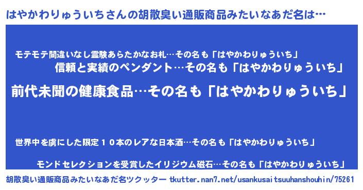 | ヘコむあだ名 | 『はやかわりゅういち(笑)』『はやっふぃ~』 |