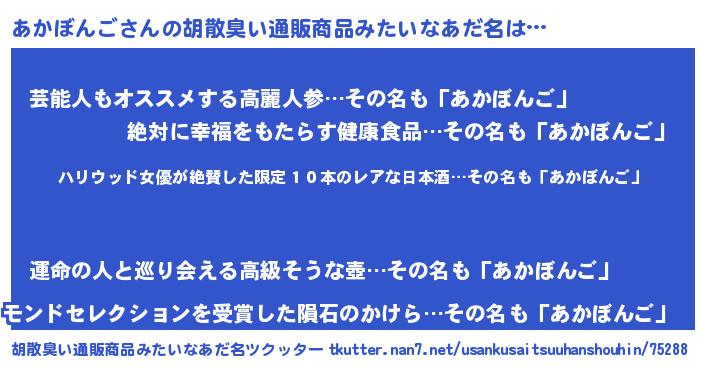 | 意味不明あだ名 | 『住所不定無職あかぼんご(65歳)』 |