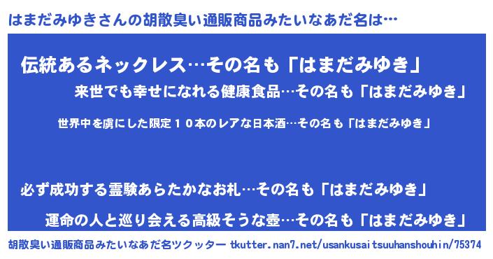 | 意味不明あだ名 | 『住所不定無職はまだみゆき(68歳)』 |