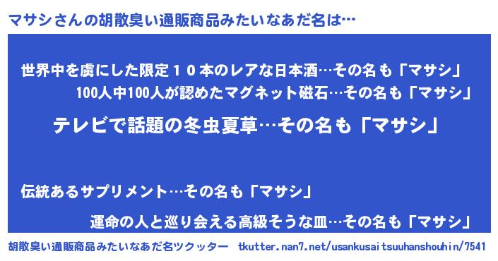 | 意味不明あだ名 | 『自称マサシ』『住所不定無職マサシ(74歳)』 |