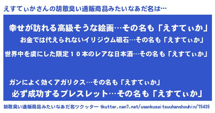 | 意味不明あだ名 | 『住所不定無職えすてぃか(14歳)』 |