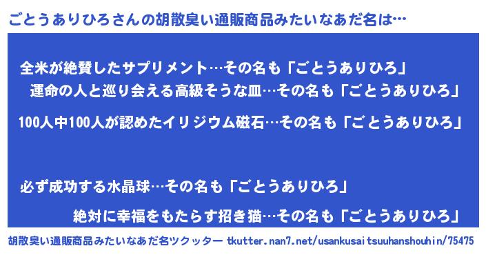 | ヘコむあだ名 | 『ごと太郎』『ごとうありひろ(笑)』 |