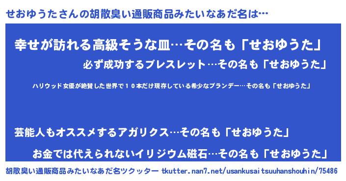 | 意味不明あだ名 | 『住所不定無職せおゆうた(91歳)』 |