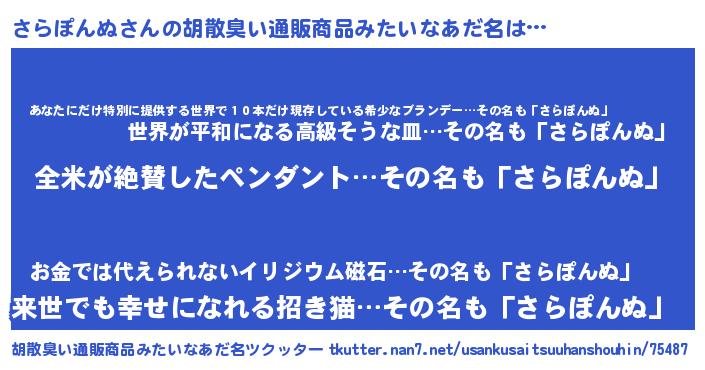 | 男性向けラノベタイトル風あだ名 | 『さらぽんぬに滅ぼされるだけの簡単なお仕事です』 |