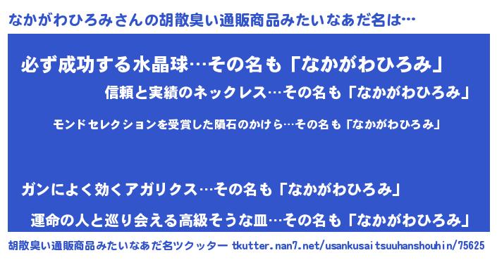 | 男性向けラノベタイトル風あだ名 | 『なかがわひろみ~年齢イコール彼女いない歴の魔法使い~』 |