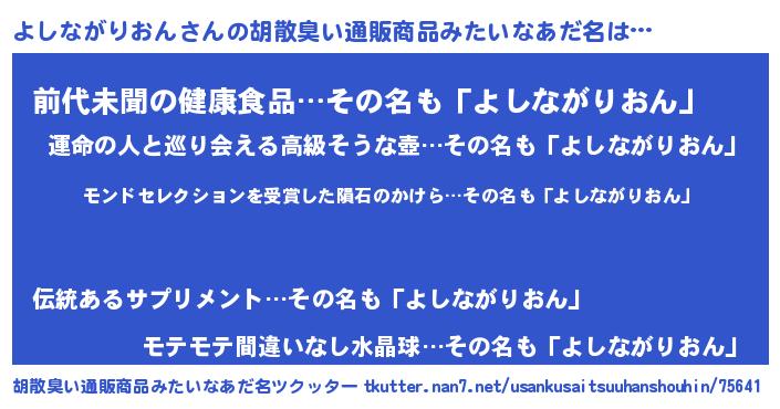 | ヘコむあだ名 | 『よしながりおん(遠い目)』『よしもー』 |