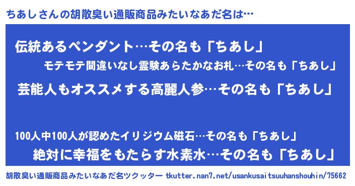 | 男性向けラノベタイトル風あだ名 | 『Re:ちあしから始める異世界生活』 |