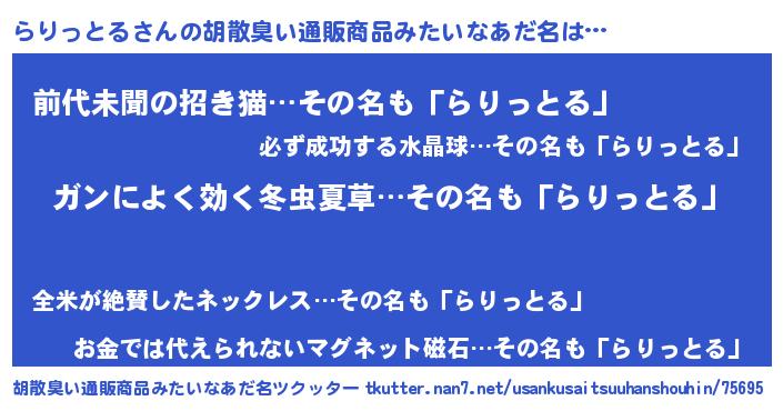 | 意味不明あだ名 | 『自称らりっとる』『ニラ科らりっとる属』 |