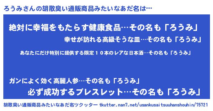 | 意味不明あだ名 | 『住所不定無職ろうみ(47歳)』『自称ろうみ』 |